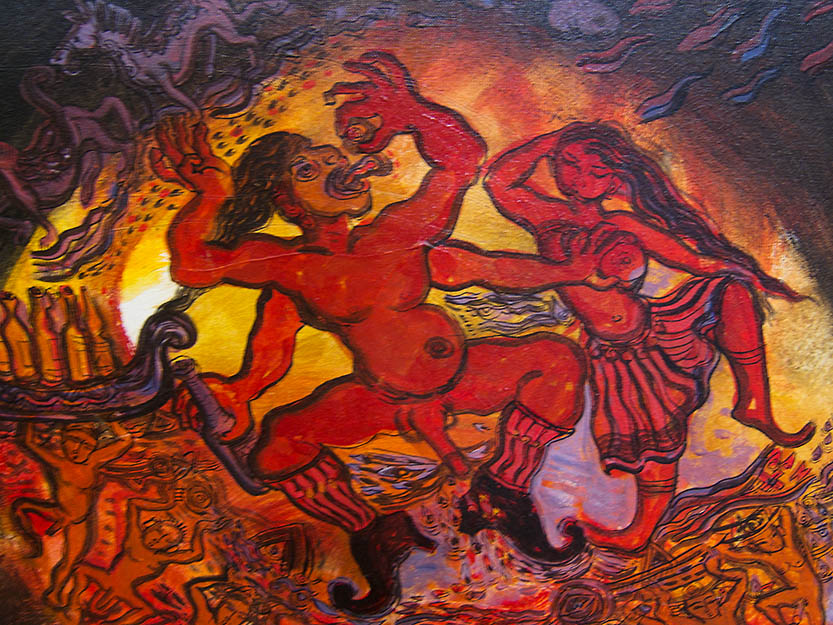 That title refers to Bali, which seems to have a healthy and well-balanced attitude towards sex and sensuality. There is a nice yin-yang curve in this painting. A red hibiscus flower worn behind the right ear indicates that she has a lover.